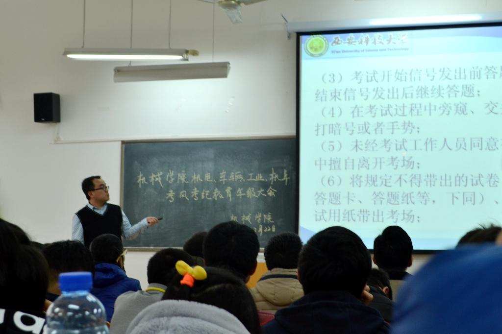 12月22日下午2点,在临潼校区9-109教室机械学院召开了2015级考风考纪教育大会。会议由15级辅导员芮智刚老师主持,15级机电、车辆、工业和机卓班全体学生参加了此次会议。