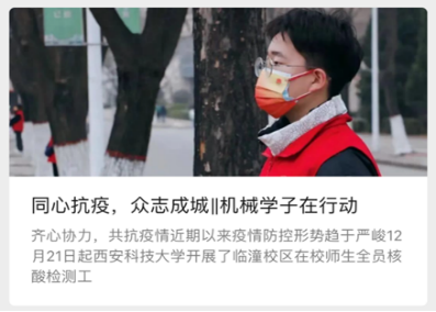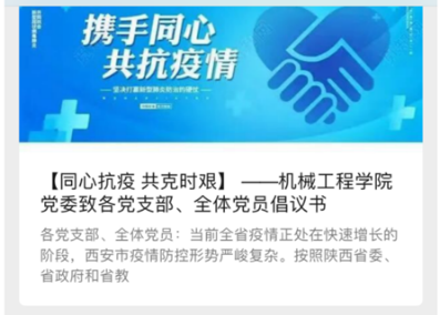 凝心聚力,科学谋划做好教育引导。一是构建“新媒体+传统媒体、学校+二级学院、教师队伍+学生组织”的宣传矩阵,通过网站、微信、微博、短视频、QQ等实行全域化开展思想教育和价值引领,传播正能量,引导学生身体力行弘扬伟大抗疫精神。二是学院发布《jdb电子游戏官方网站党委致各党支部、全体党员倡议书》《jdb电子游戏官方网站致家长的一封信》《机械学院致获奖助学生的一封信》《加强传染病防控促进学生健康成长温馨提示》倡议和号召,教育引导学生坚定信心,珍惜关爱,自觉践行社会主义核心价值观,自觉涵养“团结、勤奋、求实、创新”的校风,心怀“国之大者”,争做全面发展的新时代大学生。三是开通就业考研心理咨询绿色通道,以线上咨询线下辅导的方式为研究生升学考试学生进行心理辅导,帮助学生缓解压力。
