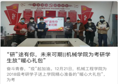 当前疫情形势严峻复杂,机械学院把疫情防控作为立德树人的首要工作,认真贯彻落实好中省及学校有关工作要求,坚决做好疫情防控期间学生管理工作,全力保障学生顺利完成研究生升学考试。