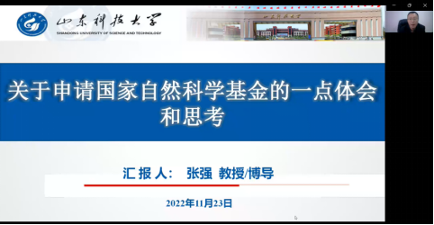 为进一步做好2023年国家自然科学基金项目申报工作,提高基金申报质量,11月23日下午,机械学院邀请山东科技大学机电学院院长张强教授做了题为《关于申请国家自然科学基金的一点体会和思考》的专题讲座,本次讲座采取线上方式,院长曹现刚教授以及学院申报基金的教师参加了讲座,副院长毛清华教授主持。