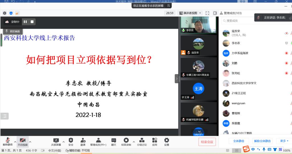 1月18日下午机械学院邀请南昌航空大学李志农教授,在线作了题为“如何把项目立项依据写到位”国家自然科学基金申请辅导报告,学院班子成员、各学科带头人及学术带头人等200余名师生参加了报告会。会议由副院长寇发荣主持。