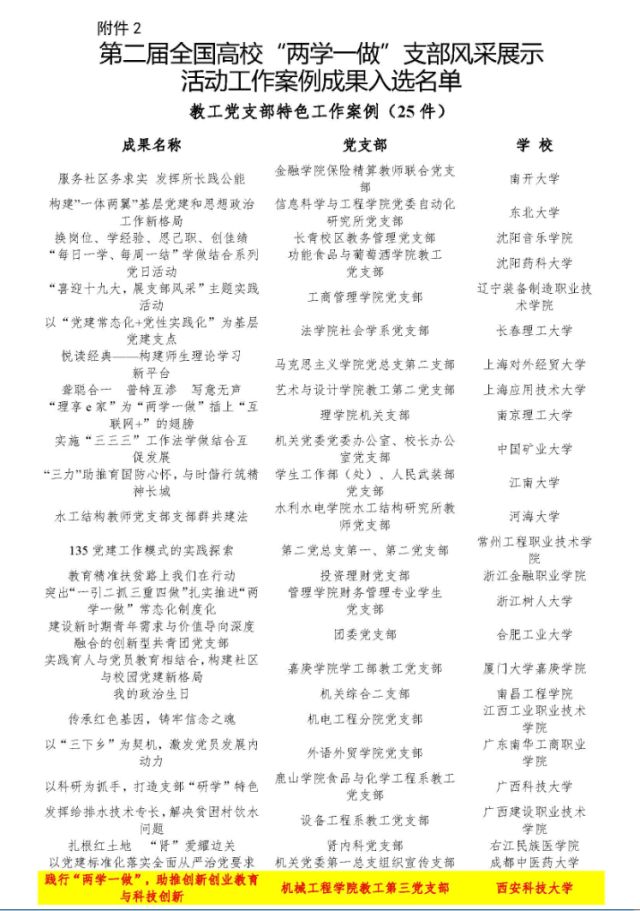 据了解,教育部组织开展的第二届全国高校“两学一做”支部风采展示活动,共收到788所高校的2352个党支部(党总支)的微党课、工作案例、推荐展示成果2602项,经专家认真遴选,共选出微党课、工作案例、推荐展示三大类各20项精品、30项优秀和50项特色成果。