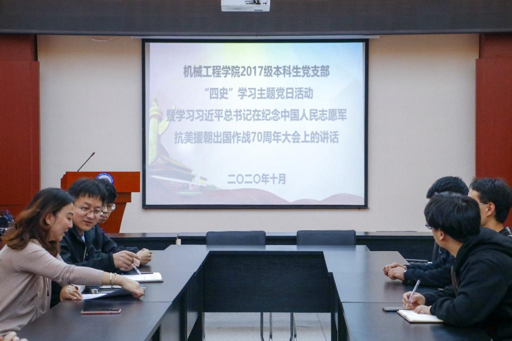 10月23日,纪念中国人民志愿军抗美援朝出国作战70周年大会在北京人民大会堂隆重举行。习近平总书记在讲话中提到:“现在中国人民已经组织起来了,是惹不得的。如果惹翻了,是不好办的!”。为了深入学习习近平总书记重要讲话精神,更好地学习党史、新中国史,更透彻地理解抗美援朝保家卫国背后的故事,10月24日下午,jdb电子游戏官方网站2017级本科生党支部组织召开“四史”学习主题党日活动。机械学院党委副书记李婉丽,机械学院党委办公室主任席芝红,jdb电子游戏官方网站2017级本科生党支部书记周学刚以及全体支部学生党员参加活动,活动由周学刚主持。