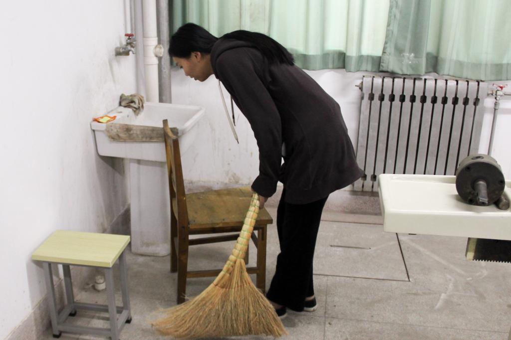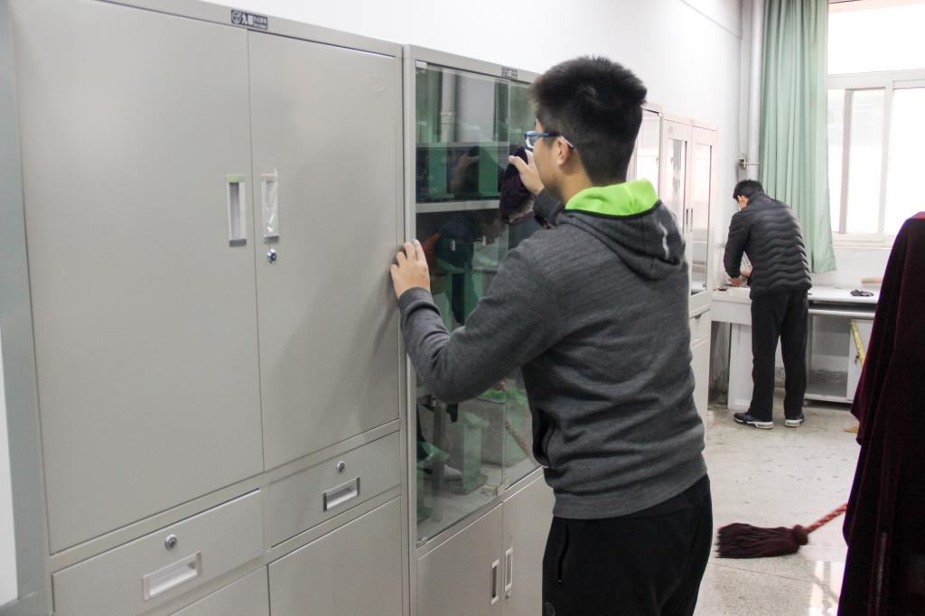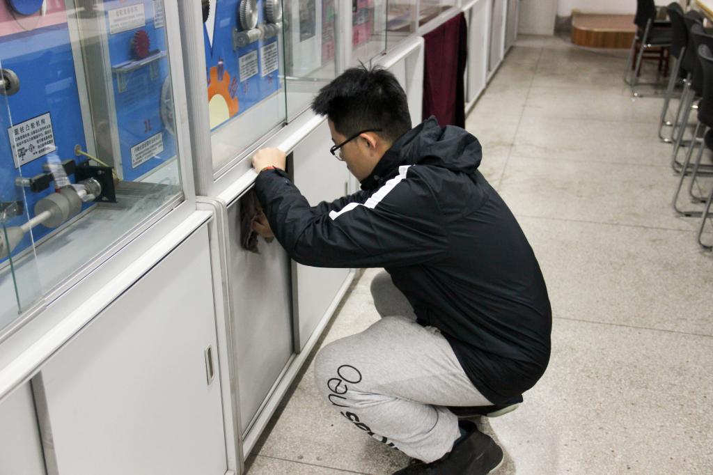 在一个多小时的劳动中,同学们积极清理垃圾,不怕脏,不喊累,相互配合。用扫把、拖把仔细清扫了地上的纸屑灰尘,并用抹布对实验室中的各个机械设备进行清洗,看起来如全新一般。