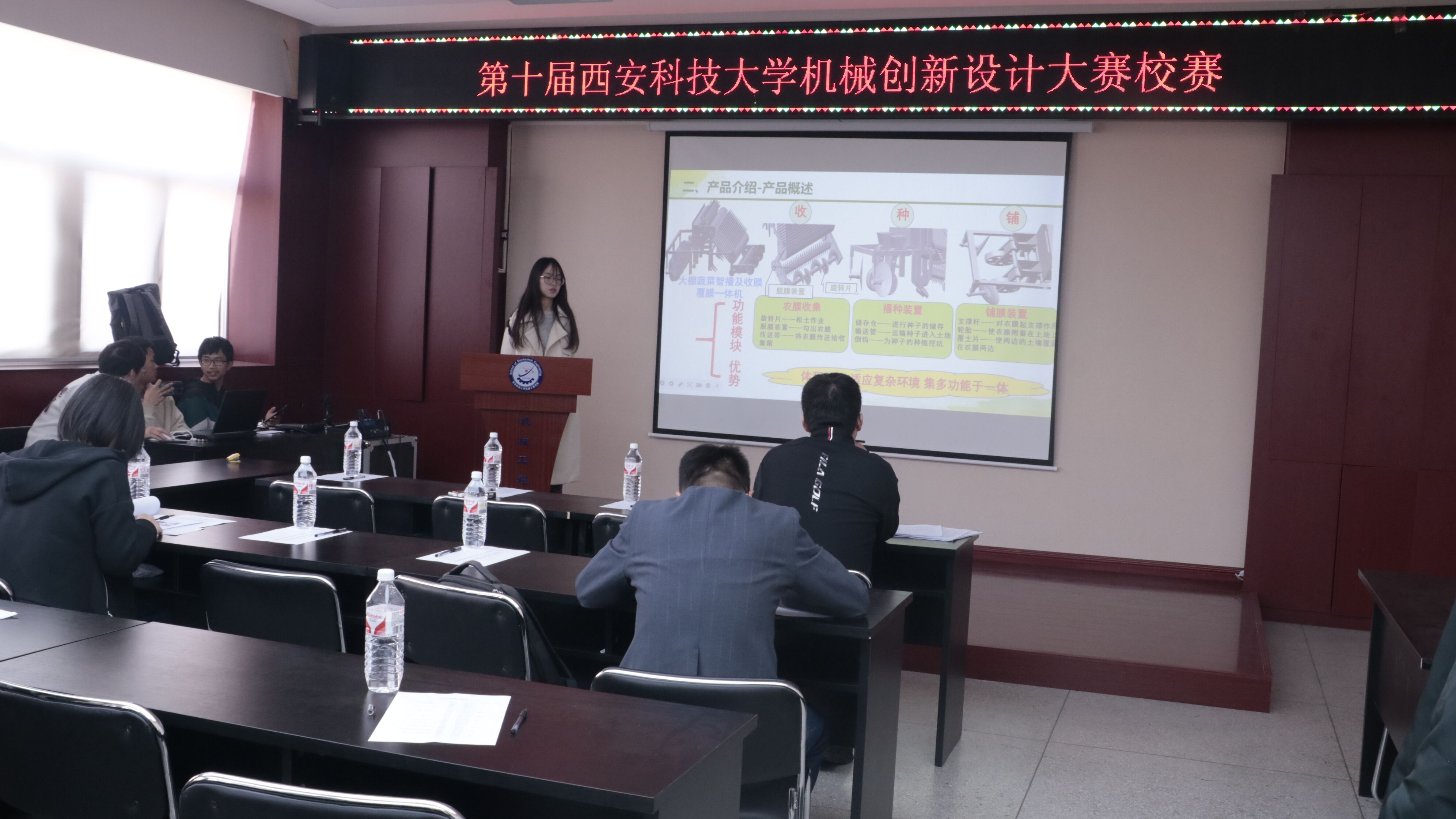 校赛现场,各参赛队伍对作品进行了功能与用途演示,其中包括智能化农业机械、仿生青蛙机器人、仿生蝴蝶机器人等多种类型的创新机械。评委分别从创意性、技术难度、实用性等多个角度对项目进行评审,并针对每个项目给予了详细的建议和指导。